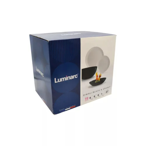 A DIWALI fekete–szürke, 19 részes étkészlet modern, letisztult formavilágával elegáns megjelenést ad bármilyen terítéknek. Az edzett üvegből készült tányérok könnyűek, mégis rendkívül tartósak, így ideálisak mindennapi használatra és alkalmi terítéshez is.
