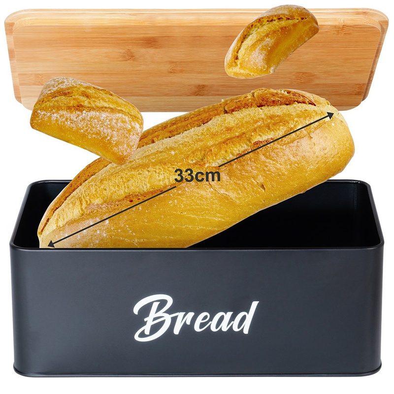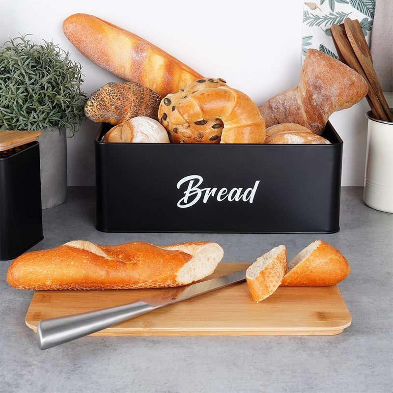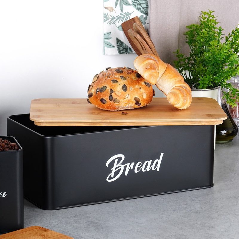 A tartók magas minőségű, porfestett fémből készültek matt fekete színben, fedelük pedig bambuszfából készült, amely természetes, meleg hatást kelt a konyhában. A kenyértartó fedele vágódeszkaként is használható, így praktikus és helytakarékos megoldás egyben.