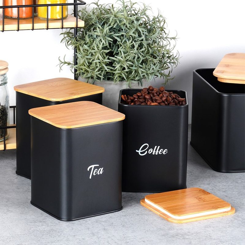 Modern 4 részes fekete fémből és bambuszból készült kenyértartó és tároló szett. Stílusos megoldás kenyér, kávé, tea és cukor friss, rendezett tárolásához.
