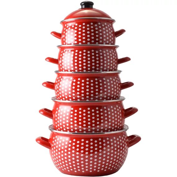 Piros pöttyös zománcozott lábas fedővel 20 cm, 3,8 liter – zománcozott acél edény mindennapi főzéshez, gáz-, elektromos-, kerámialapos és indukciós tűzhelyen is használható, 1100 g súllyal, könnyű tisztítással és klasszikus pöttyös dizájnnal.