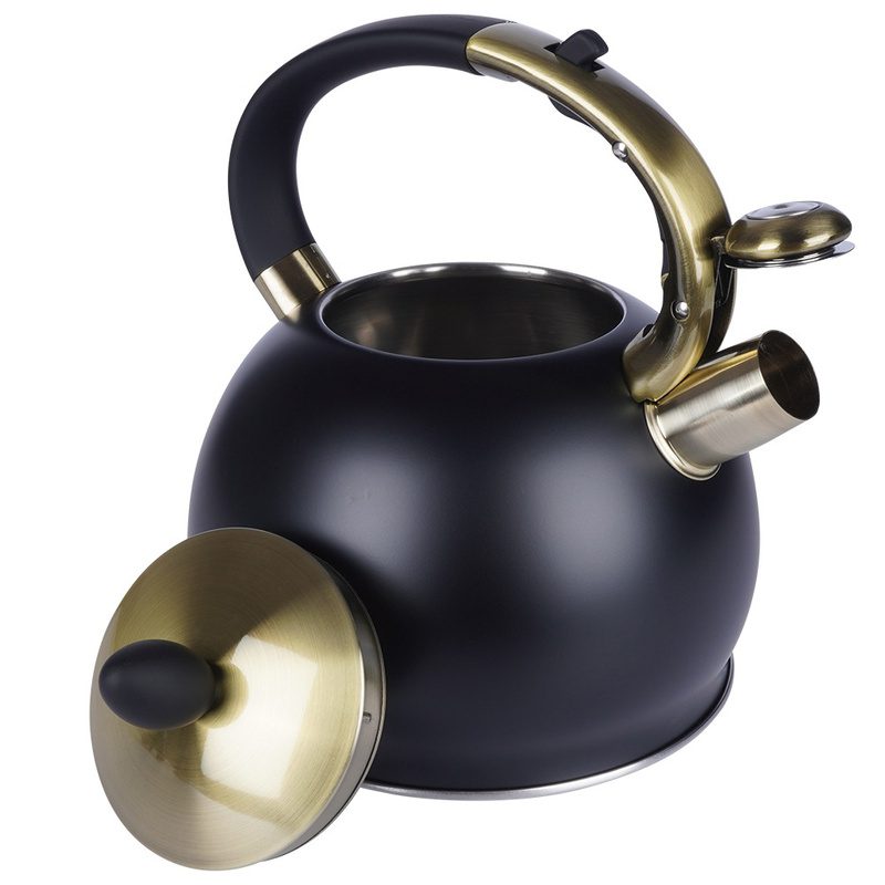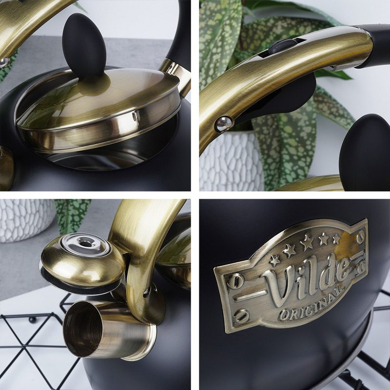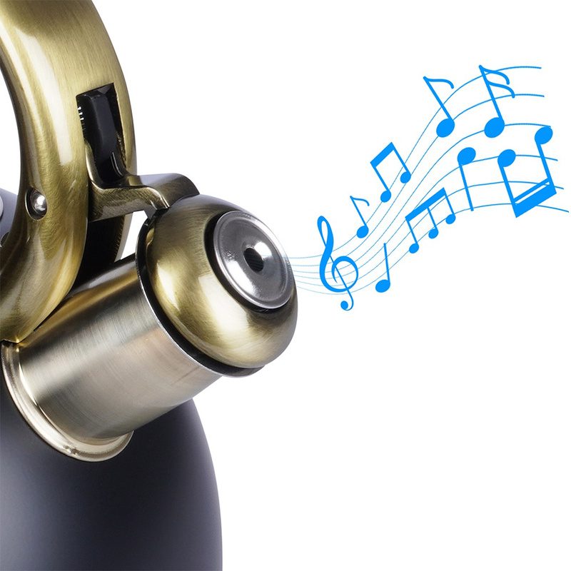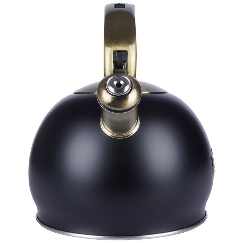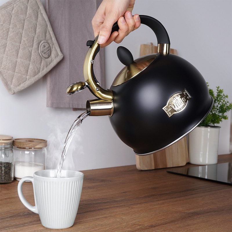 A 3 literes, fekete rozsdamentes acél sípoló vízforraló kanna elegáns és időtálló kiegészítője minden konyhának. A matt fekete felület és az antik arany színű részletek különleges, exkluzív megjelenést biztosítanak, amely modern és klasszikus enteriőrben egyaránt megállja a helyét. A kanna teljes űrtartalma 3 liter, ajánlott hasznos űrtartalma 2,5 liter. Magassága 22,5 cm.