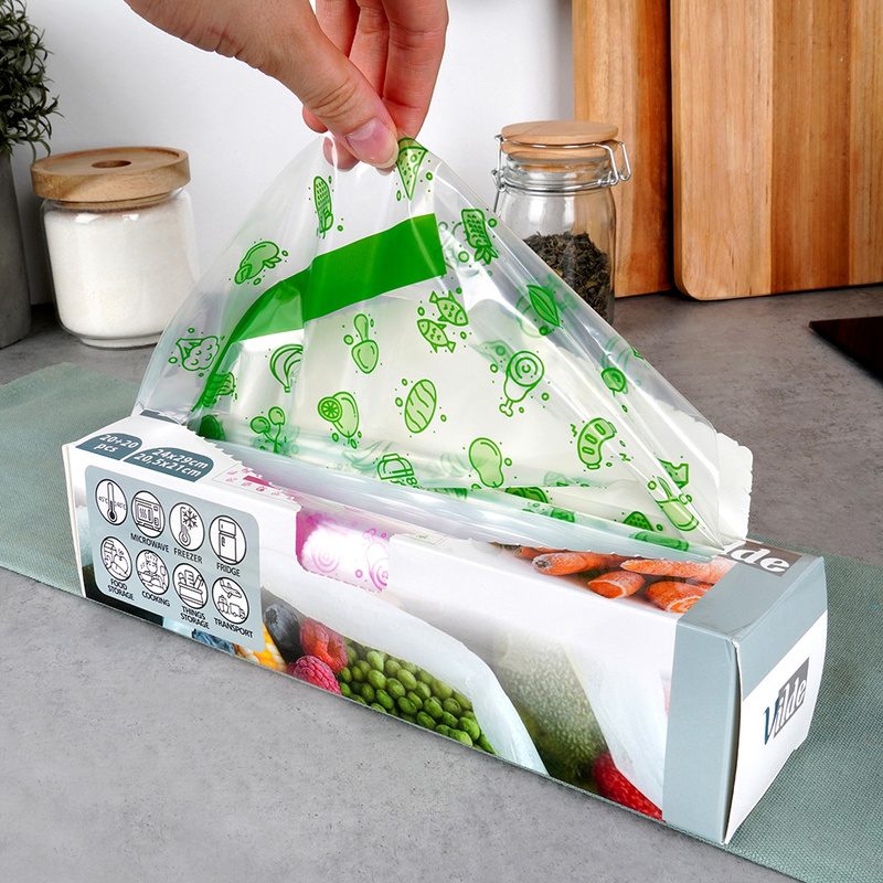 A 40 darabos visszazárható tasak szett két méretben érkezik, így tökéletes választás az élelmiszerek praktikus tárolásához, fagyasztásához és rendszerezéséhez. A készlet 20 kisebb tasakot (20,5×21 cm) és 20 nagyobb tasakot (24×29 cm) tartalmaz, így könnyedén elhelyezhetők benne gyümölcsök, zöldségek, húsok, sajtok, snackek, vagy akár utazáshoz szükséges apró kiegészítők.